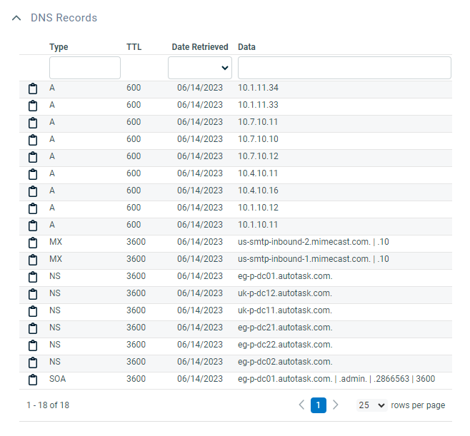 The DNS Records component will by default appear third from the top on the main body, below the WHOIS Information component, but the order can be modified. It contains a table with a quick filter row.