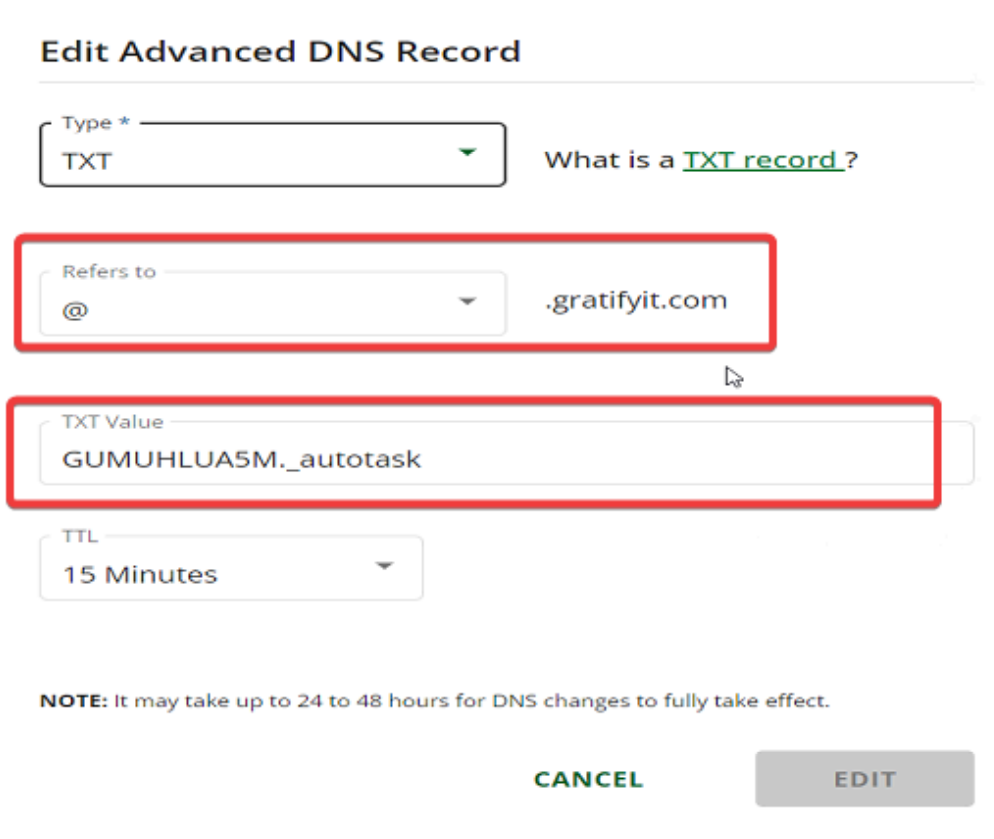 v=spf1 include:autotask.net ~all NOTE For the SPF record, ensure that include:autotask.net is listed among the first three entries if the record is lengthy. The tilde (~all) is important for proper validation; however, if your DNS provider requires it, Autotask can also authenticate with a dash (-all). If the dash does not work, we recommend changing it back to a tilde. |