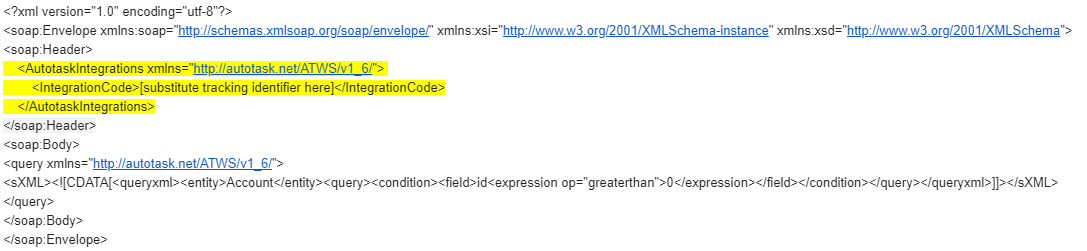 IMPORTANT They must also add the xmlns="http://autotask.net/ATWS/v1_6/" tag, or the integration won't work properly.