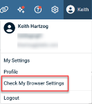 You can access the browser checking utility at any time. Hover over your name in the upper right corner of the navigation bar to open the user menu and select Check My Browser Settings.