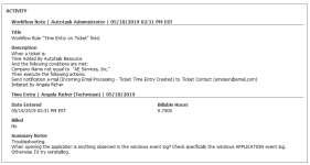 The Activity section includes time entries, attachments, workflow notes and task or ticket notes, sorted by entry type and date. Newest items display first.