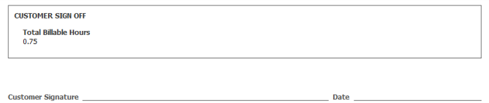 The Customer Sign Off check box adds a Signature and Date line to the bottom of the printed ticket, along with the Total Billable Hours currently on the ticket. This check box also hides information you probably don't want to share with the customer, including the total hours worked (for the entire ticket and for each time entry), any Notes marked internal, Unit Cost and Our Cost on ticket charges, and all to-dos. If the Charges & Expenses check box is selected, all expenses are included, both billable and non-billable.