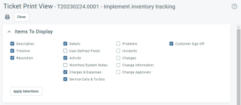 • The print view respects all security level permissions that apply to the Ticket page, including the Render all Tickets as Ticket Category settings.