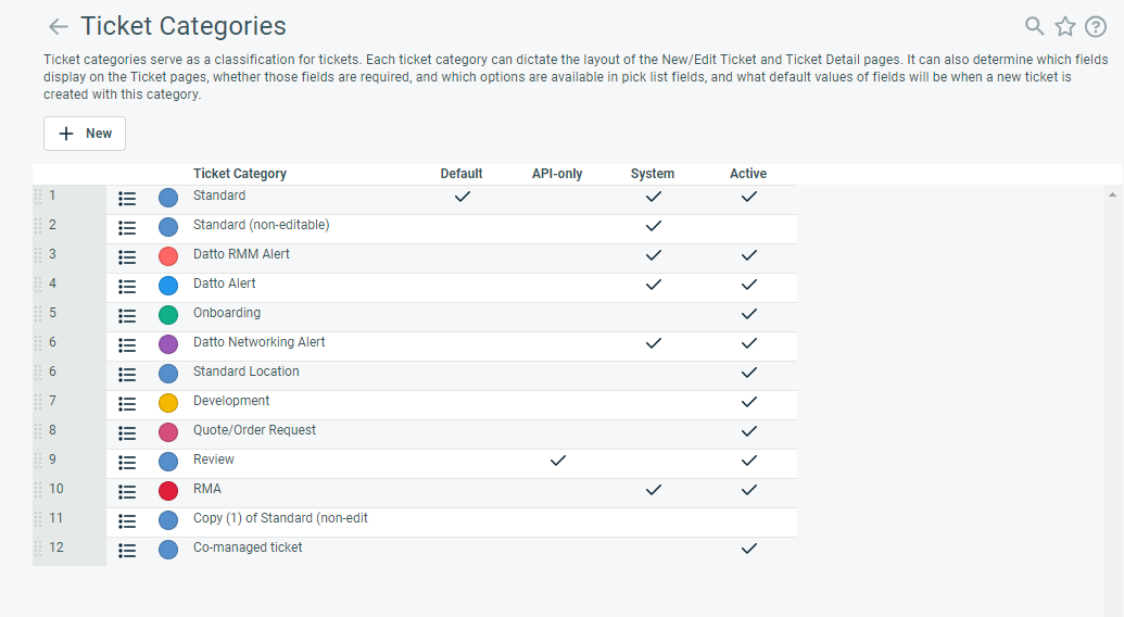 Only available on the Ticket Categories, Device Categories, and Organization Categories pages. A check mark indicates that this category is only available when items are created or edited via the API. The check box is disabled for ticket categories associated with Incoming Email Processing, Client Portal request types, or if it is the Standard, Alert, or Standard (non-editable) ticket category. API-only categories cannot be set as the default or Client Portal default category. Also refer to API-only Categories. |