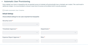 • When you enable Access Groups, the Security Level will only override the default Security Level (configured in the Automatic User Provisioning section) if Autotask has one (and only one) Security Level that exactly matches the name of a Kaseya One Access Group.