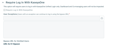 Require Login with Kaseya One This will require all users to login with KaseyaOne unless an exception has been granted.
