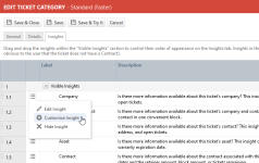 NAVIGATION Left Navigation Menu > Admin > Admin Categories > Features & Settings > Service Desk (Tickets) > Ticket Categories > context menu for selected category > Edit > Insights tab