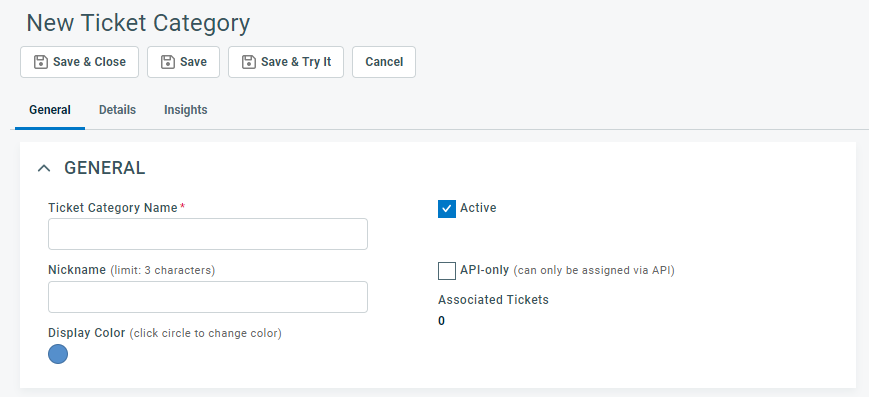 NOTE This topic describes the General tab of the New Category or Edit Category pages. The page has two additional tabs: Details tab and Insights tab. For details on these tabs, refer to The Details tab and The Insights tab.