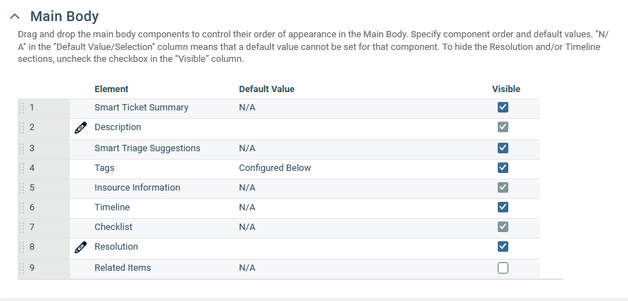You can hide the resolution component. The Visible check box is editable. You do not need to click the pencil icon. When the check box is selected, the Resolution field appears on the ticket. Click the check box to clear or select it. |