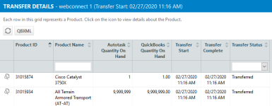 NOTE  A complete inventory synchronization is done in batches. Each row in the Transfer Details table represents a Product. However, the QBXML is generated for the entire batch and can be opened by clicking the QBXML button at the top of the table.